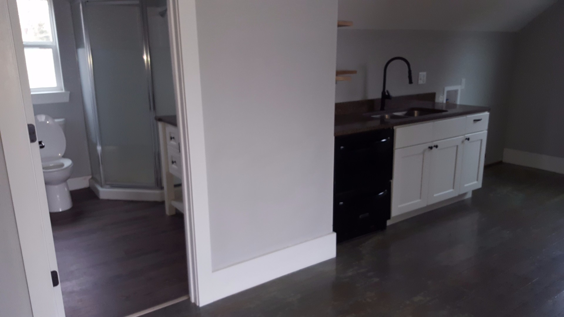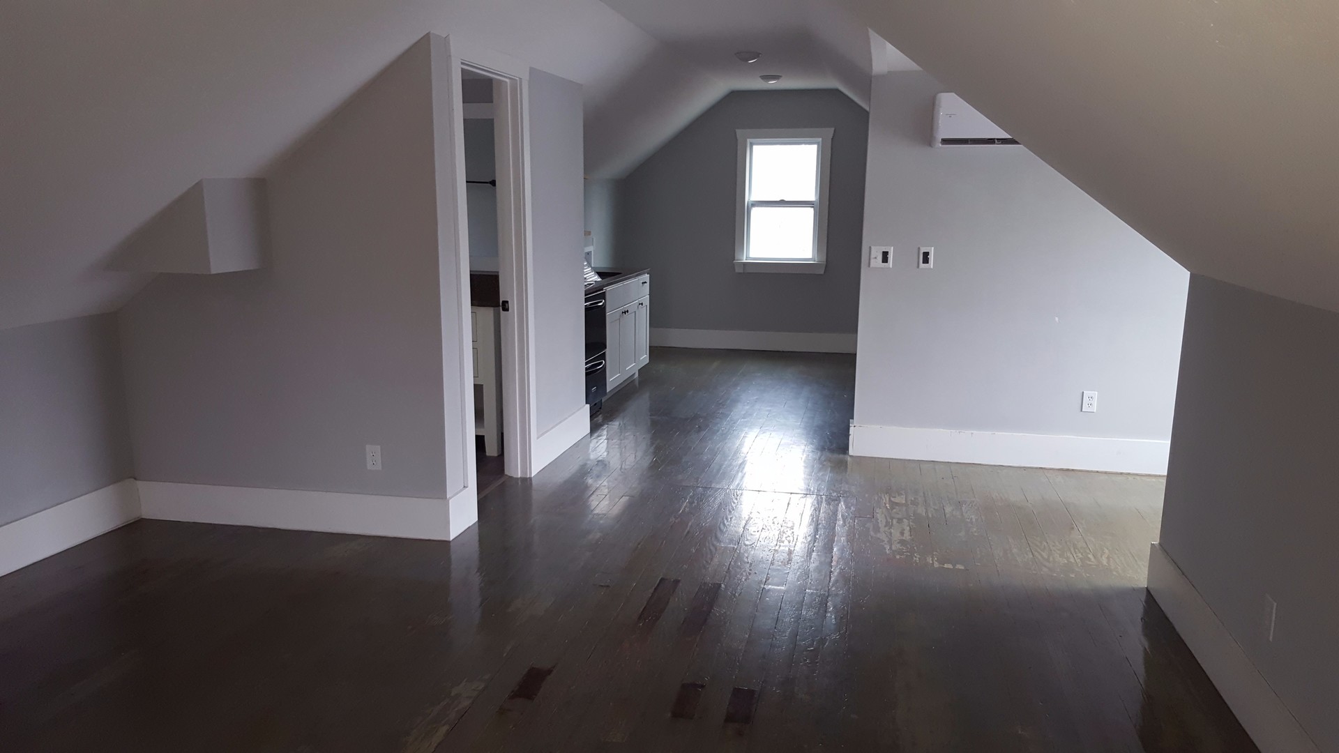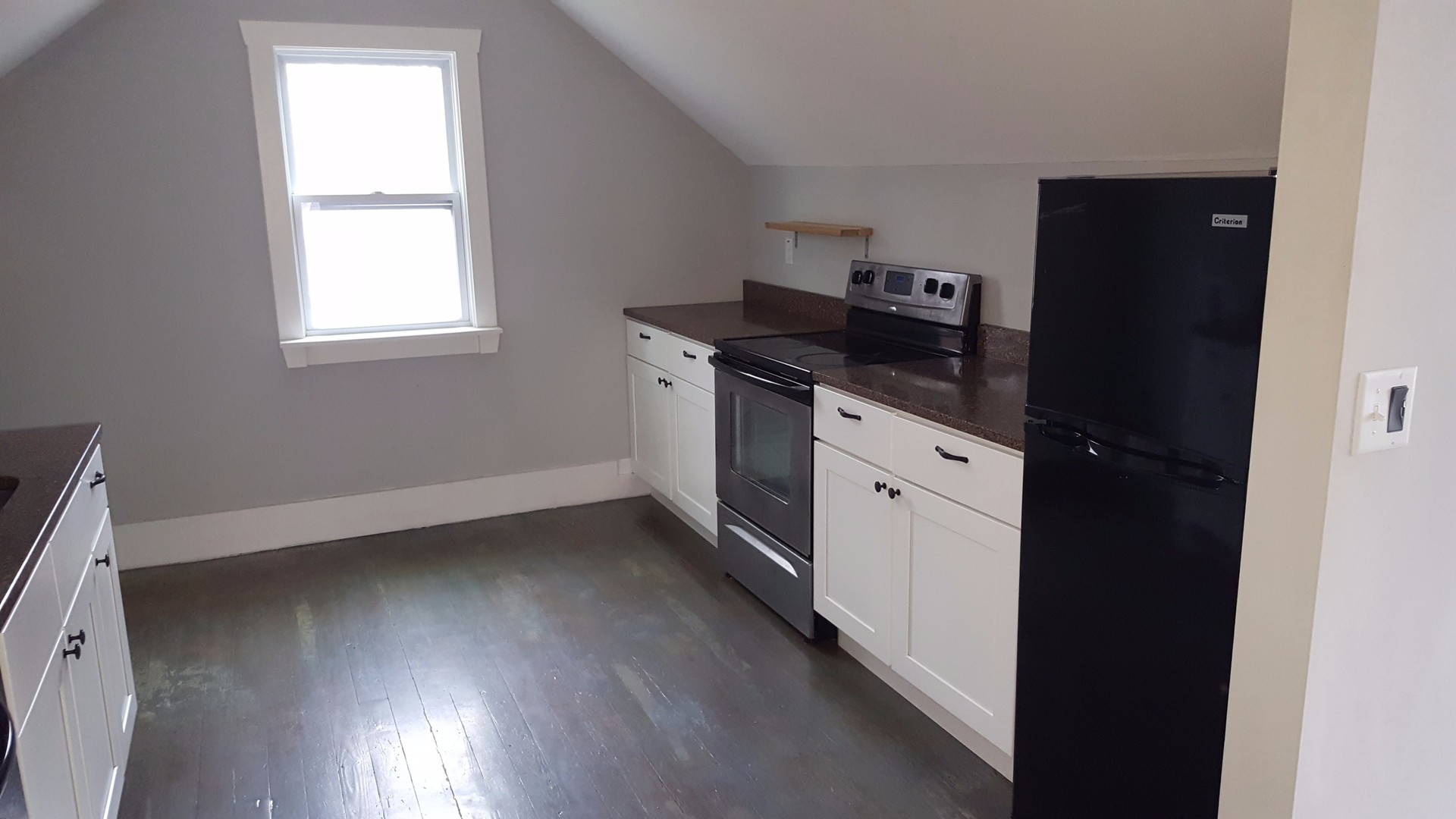 Studio top level apartment, central location with off street parking, water paid, AC, DW, w/d hookups, wood floors